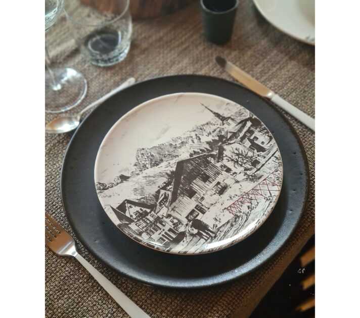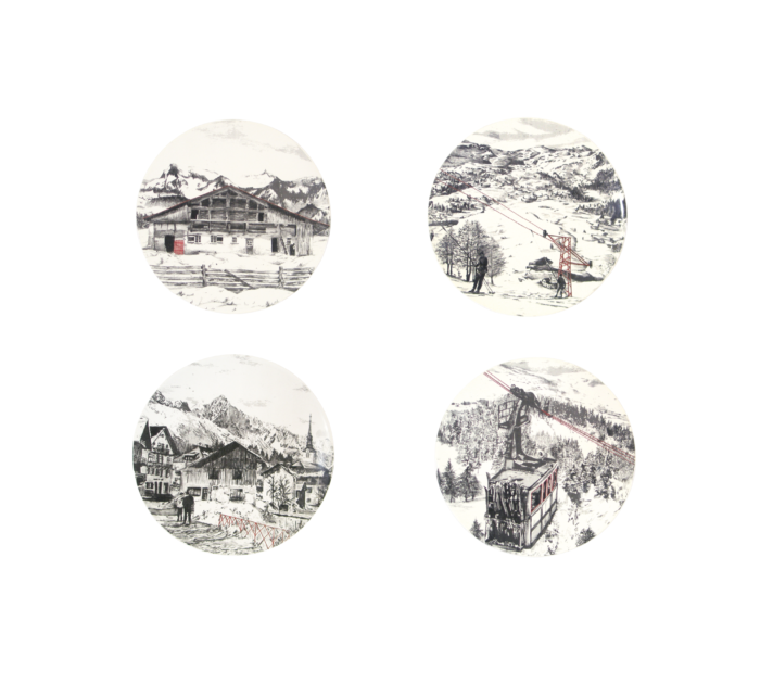 Les dessins sont des créations exclusives Angel des Montagnes et sont appliqués sur des assiettes en céramique blanche. Sur chaque illustration en noir et blanc se cache un élément de décor en rouge.